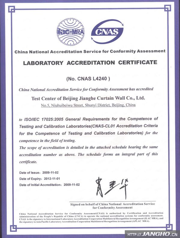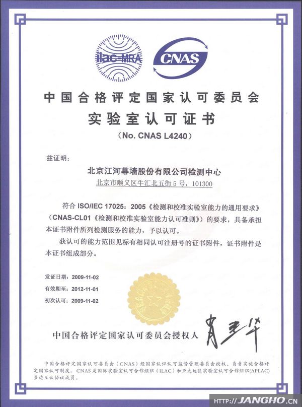 11月2日,北京江河幕墻股份有限公司檢測中心正式獲得中國合格評定國家認可委員會CNAS實驗室頒發的認可資質證書,標志著江河幕墻檢測中心順利通過了國際ISO17025標準的認可,綜合檢測能力得到行業組織的國家認可,成為國內幕墻企業首家通過CNAS評審的出口企業檢測中心,并成功列入國家獲準實驗室認可機構名錄。今后,檢測中心可在認可檢測范圍內使用CNAS實驗室認可標志和ILAC國際互認聯合標志,并有機會參與國際合格評定機構認可雙邊、多邊合作交流。